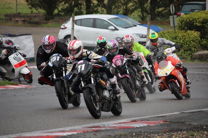 Course sous la pluie. Papa m’a fait beaucoup travailler tout l’hiver sous la pluie. La j’étais dans mon élément. J’ai montré qui c’était le champion en titre. Je gagne la course avec un tour d’avance sur le deuxième avec une chute de ma part.